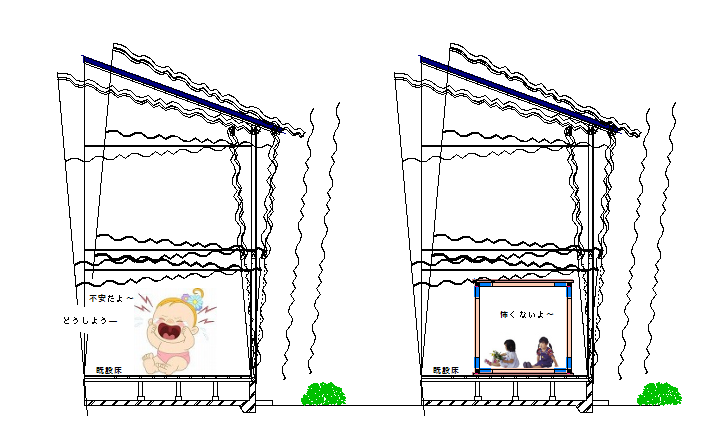 ちょっと大きめの地震があると小さいお子様や、介護が必要なご老人がいるご家庭の方は大変心配ですよね。 ましてや大地震の時には、どこに避難していいものか迷ってて手遅れになってしまいます。 普段からお子様が遊ぶ場所や介護ベットの周りなどを強靭な シェルターで守ってあげてはいかがでしょうか? 万が一住宅が倒壊してもシェルターの中なら安全を確保できます。 大げさな耐震工事を行わない為、安い値段で工事できます。